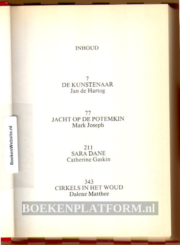 Inhoud: De kunstenaar, Jan de Hartog - Jacht op de Potemkin, Mark Joseph - Sara Dane, Catherine Gaskin - Cirkels in het woud, Dalene Matthee.